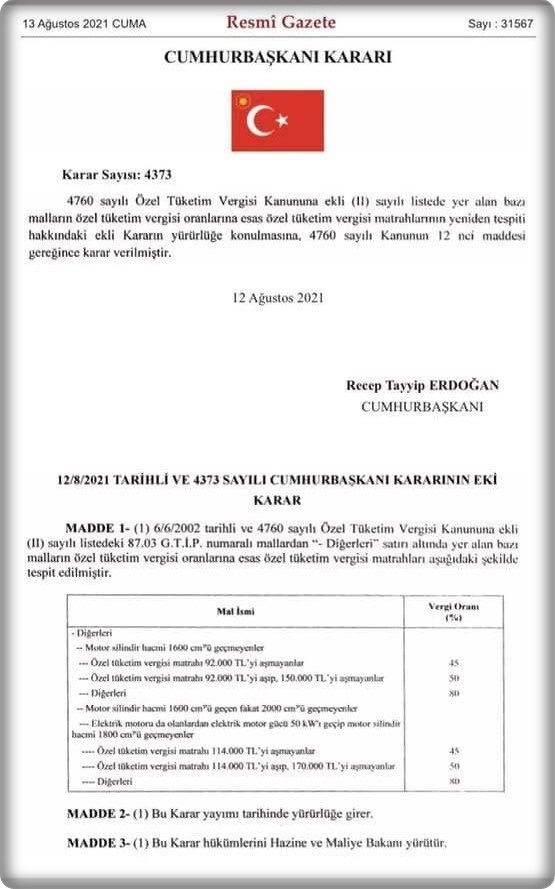 13 AĞUSTOS 2021 ÖTV İNDİRİM KARARI
