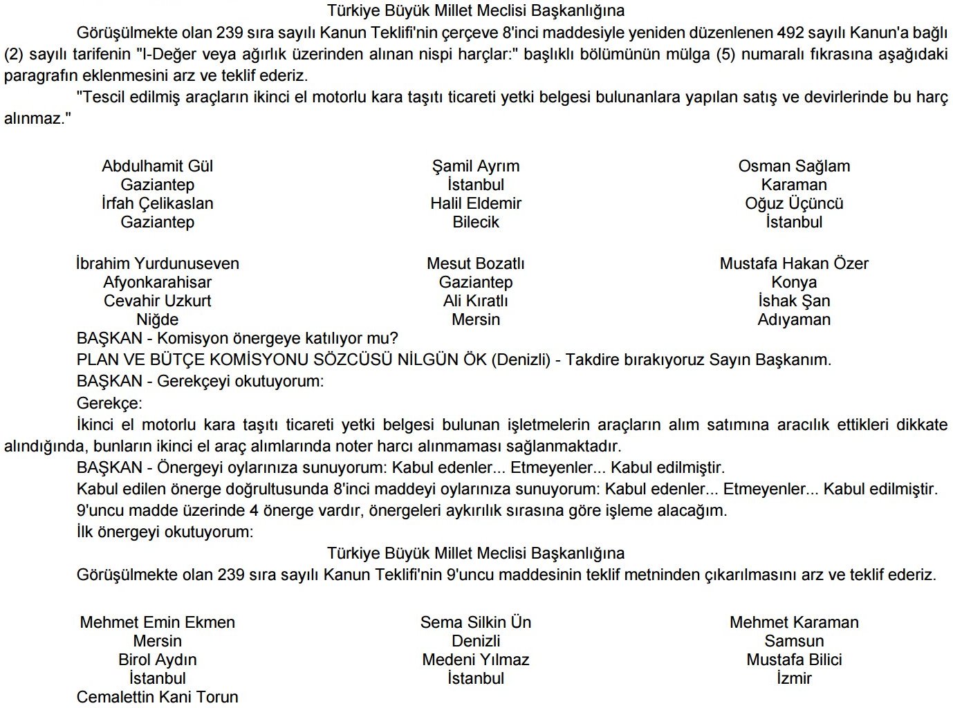 Genel Kurulda verilen ve kabul edilen önerge ile ise;